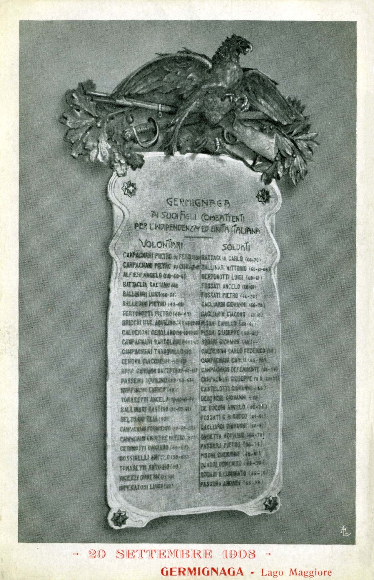 Cartolina ufficiale stampata dalla Tipografia Commerciale di Luino nel 1908, in occasione della posa della lapide dedicata ai germignaghesi che combatterono per l`Unità d`Italia.
