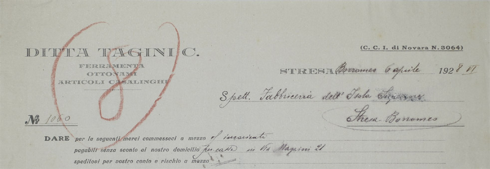Eserc., Tagini Ferramenta, fattura, Stresa 1928 Eserc., Tagini Ferramenta, fattura, Stresa 1928