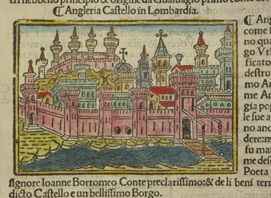 Nel libro Supplemento de Croniche di Jacopus Philippus (Frate Jacopo Filippo da Bergamo) edito a Venezia dai Bindoni nel 1535, è contenuta una descrizione della Città di Angera, con una incisione in legno (cm. 9 x 6,5) che rappresenta una fantasiosa immagine della Città, ed una ancora più fantasiosa genealogia dei Visconti Duchi di Milano e dei Conti di Angera.