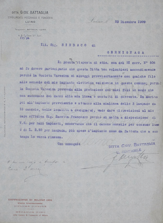 Stab. Battaglia - Luino - Lettera 1909 dic 23 Stab. Battaglia - Luino - Lettera 1909 dic 23