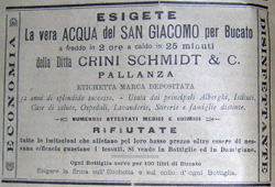 Esigete la vera acqua del San Giacomo per bucato a freddo in 2 ore a caldo in 25 minuti della Ditta Crini Schmidt & C. Pallanza – Etichetta marca depositata – 12 anni di splendido successo. Usata dai principali alberghi, istituti, case di salute, ospedali, lavanderie, stirerie e famiglie distinte. Numerosi attestati medici e chimici. Rifiutate tutte le imitazioni che alletano pel loro basso prezzo oltre essere di nessuna efficacia guastano i tessuti. Si vende in bottiglie ed in damigiane. Ogni bottiglia serve per 100 litri di bucato. Esigere la firma sull’etichetta e sul collo d’ogni bottiglia. Economia – Disinfettante.