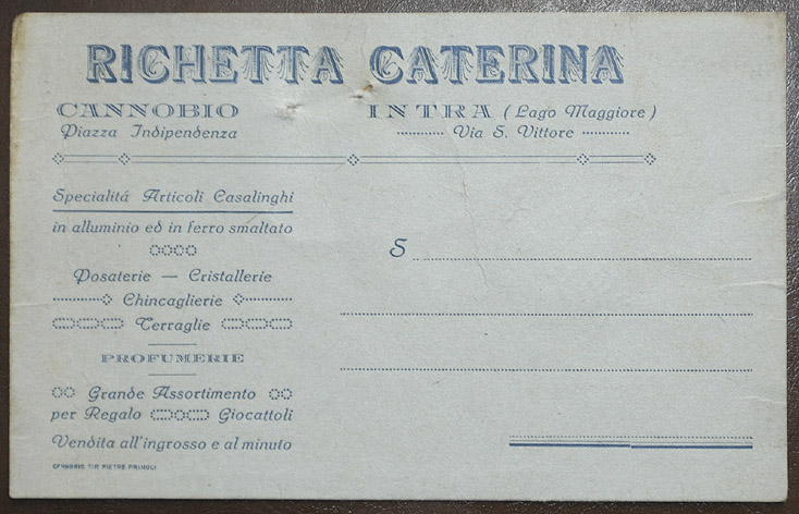 La stampa del cartoncino commerciale venne eseguita dalla Tipografia Pietro Pirinoli di Cannobio.