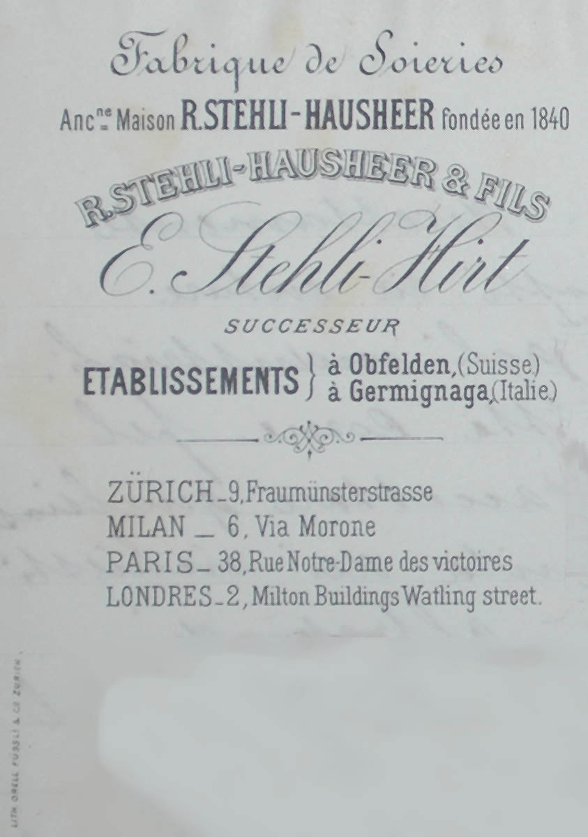La storia della ditta Stehli è lunga e complessa, e da sola vale ben altro che un cenno. Qui si riporta solo la carta intestata del 1887, ripresa da un originale ospitato in una collezione privata germignaghese.