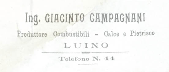 Si tratta del ben noto e valente professionista luinese, che oltre ad un affermato studio d`ingegneria, era di alta intraprendenza al punto da praticare il commercio di inerti da costruzione e di combustibili (legna a fascine) e fossili (antracite tedesca).