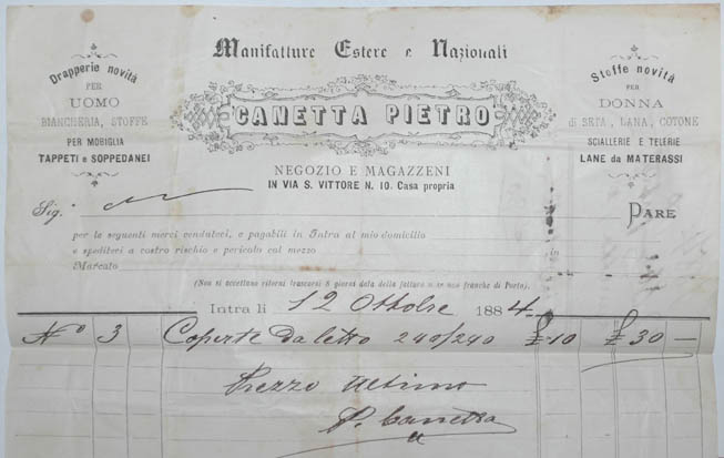 Eserc., Intra, Pietro Canetta, Drappiere, fl. 1884 Eserc., Intra, Pietro Canetta, Drappiere, fl. 1884
