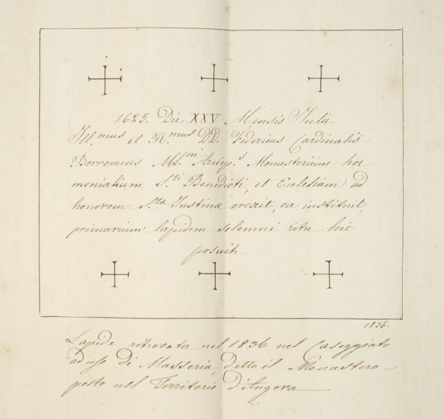 Una nota di pugno dell`archivista borromeo informa: ”Lapide ritrovata nel 1836 nel caseggiato ad uso di masseria, detto “il Monastero”, posto nel territorio d’Angera”.