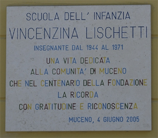 La lapide, posta sul muro perimetrale dell’edificio scolastico di Muceno, ha la particolarità che il testo è scritto, nella parte che riguarda l’insegnante Lischetti, di antica famiglia locale, in caratteri di multicolori.