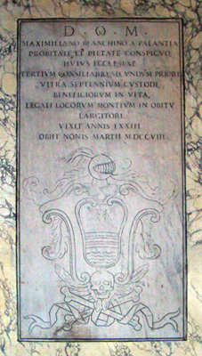 A DIO OTTIMO MASSIMO A Massimiliano Bianchino da Pallanza Esimio per probità e pietà e di questa Chiesa Tre volte Consigliere, due Priore, Custode oltre un settennio, largitore di benifici in vita, del lascito di luoghi dei monti in morte visse anni 73 morì il 7 marzo 1708
