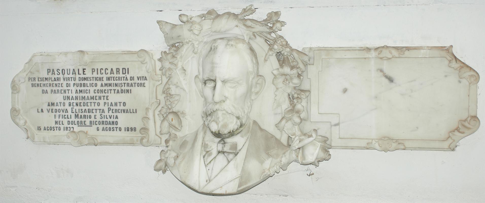 Elegante altorilievo. Al centro, le fattezze di Pasquale Piccardi inserite in una corona di fiori e foglie; ai lati due sezioni per epigrafi. Solo quella di sinistra è stata utilizzata.