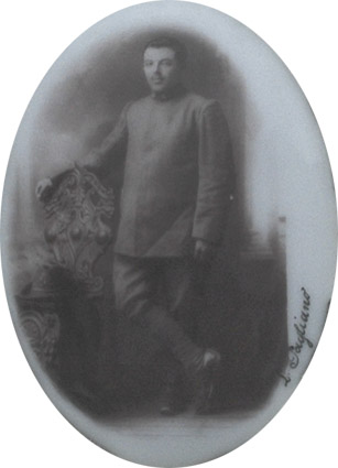 [fotografia ceramica inserita in ovale tra fronde di quercia]