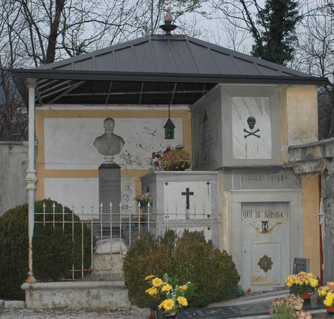 La Tomba Bonera è certamente una tra le più complesse, per ideazione e apparato architettonico, condiviso per cospicuità forse solo con quella del pittore-decoratore Davide Pozzetti, entrambe allineate sul fondo del muro perimetrale cimiteriale antico del San Giorgio di Runo, e anzi quella Bonera proprio a costituirne l’angolo a valle. Complessa, e interessante: ché se per la tomba Pozzetti l’interesse risiede innanzitutto nella scenografia (quella bella abside con parete e catino affrescati, il busto in bronzo del giovane, l’imponente trabeazione classicheggiante del fronte), altri sono i motivi di discorrere dei sepolcri Bonera. Piace avanti tutto notare la cospicuità di alcuni tra i personaggi che negli avelli dormono (Leopoldo Bonera e Giuseppe Bonera, ma anche, riteniamo, Luigi Bonera e altri esponenti delle famiglie imparentate: Casnedi, Rossi, Cucchetti); ma non solo. Pensiamo di non andare troppo distanti dal vero, congiungendo alle virtù civili di Leopoldo Bonera anche non poche simpatie massoniche; lo dimostrerebbero, oltre, alla ribadita obbedienza all’insegnamento mazziniano e garibaldino, anche quella discreta (ma non poi troppo) ostentazione dei simboli (l’occhio nella piramide; il triangolo, la squadra e il compasso; il teschio e le tibie incrociate) che sono tipiche delle devozione di loggia. Ma non finisce qui l’interesse per la tomba Bonera. Alla cripta non s’entra per una porta anonima, ma piuttosto per una porticina su cui una clessidra indica lo scorrer del tempo: ammonisce, sopra, un motto risoluto: «QUI SI RIPOSA», nella piena coscienza di aver compiuto il proprio dovere di uomini e di cittadini. Tutto infatti sembra ruotare intorno a quel busto di Giuseppe Bonera, defunto «il 6 gennaio 1890 / nell’età di 83 anni» ed effigiato nel marmo in centro al complesso funebre.
