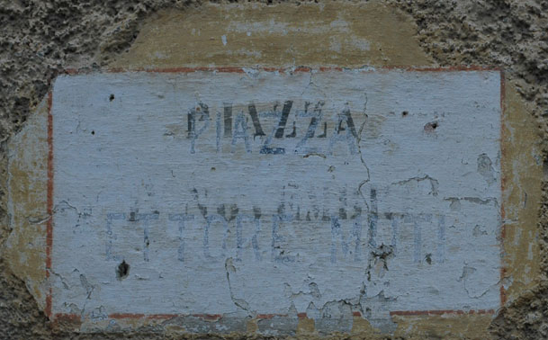 Targa a fresco con indicazione della denominazione della piazza: IV Novembre, o - durante il periodo fascista - ”Ettore Muti”