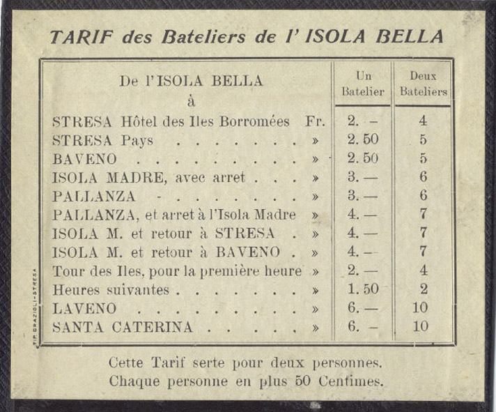 In allegato fotografico, si mostra un prospetto a stampa opera della tipografia Grazioli di Stresa, preparato circa nel 1910, e recante le tariffe per le corse di barca a remi sulle tratte: